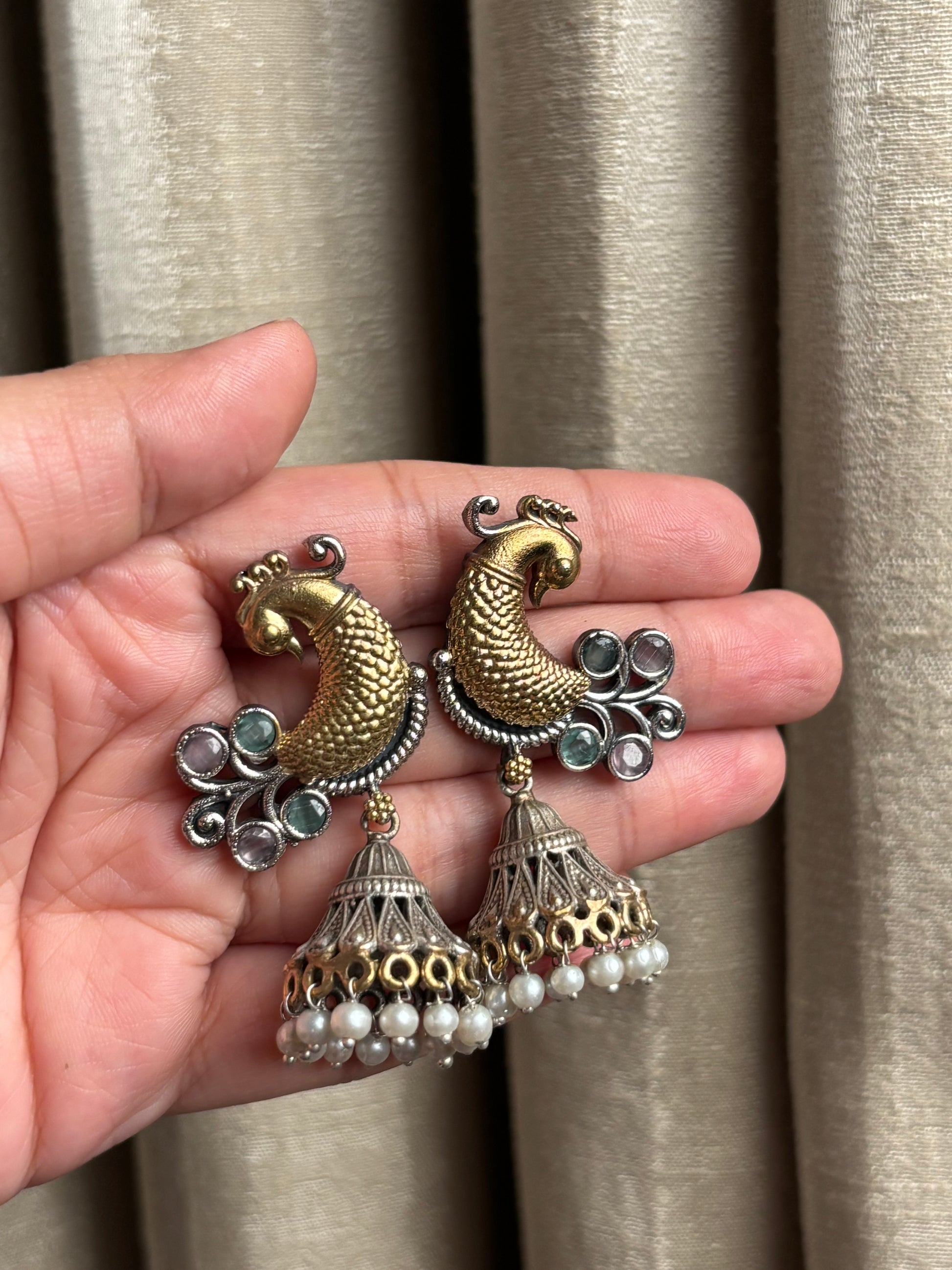 Aarohi Pink & Sea Green Peacock Dual Tone Earrings