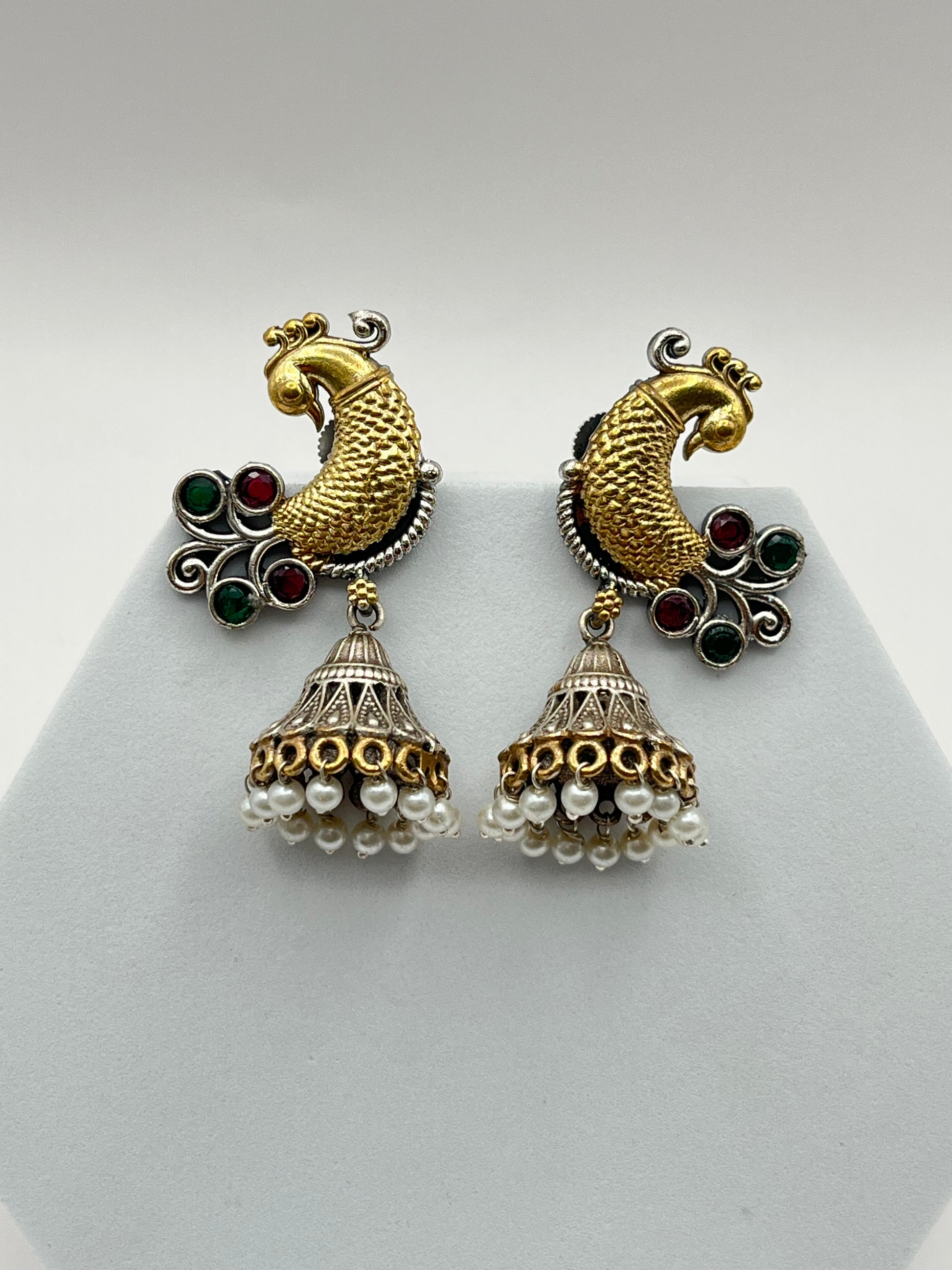 Aarohi Red & Green Peacock Dual Tone Earrings